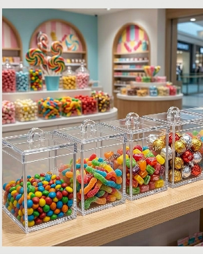 pote com tampa de acrílico, display de acrílico para doces, produtos em