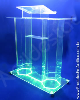 Púlpito em acrílico, fabricado com espessuras de 8,0 na mesa, base e suporte de água, nas cores: Cristal (transparente), Azul, Verde e Fumê.